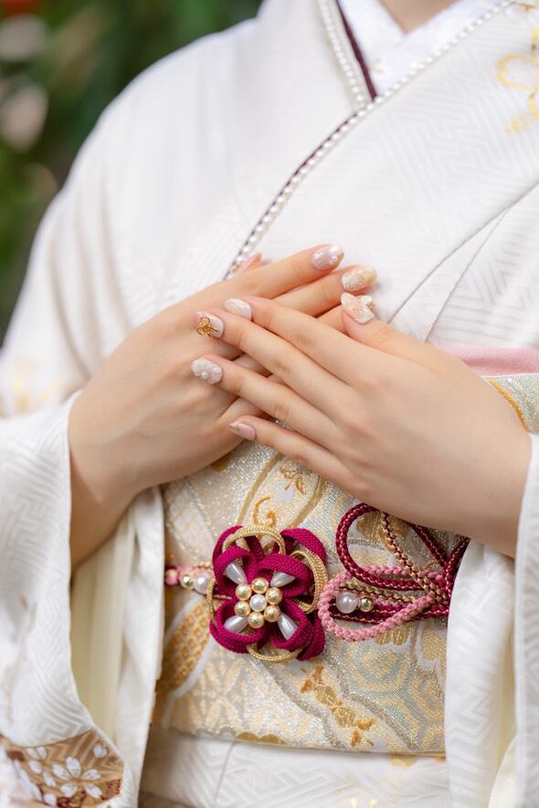 柔らかい乳白色にゴールドが輝き 繊細な花模様が咲く上品ネイル。 縁起が良いとされる「梅結び」モチーフが 凛とした美しさと和を演出します。 白無垢・白振袖にそっと寄り添う、 花嫁様のためのブライダルネイル。 おすすめご利用シーン ・和装の結婚式(白無垢・色打掛) ・成人式や卒業式(白振袖・白袴) ・前撮りやフォトウェディング こちらはお客様のサイズに合わせて 作成するネイルチップです。 チップの形は4種類よりお選び頂けます。 セット内容 ・ネイルチップ 10本 ・接着グミ 1回分 ・ウッドスティック1本 ・ミニやすり 1つ ・説明書 【ご購入の流れ】 測り方の参考画像を載せておりますので、 そちらをご参照の上、お爪のサイズをメジャー等で測って頂きます^^ 動画はこちら→ https://www.instagram.com/reel/C4r9YJmpqqD/?igsh=NG9pZ2dna2NlbXJt (測る時は直線幅ではなく爪の丸みに沿って端から端までお測りください。迷われたら1つ上のサイズをおすすめします)